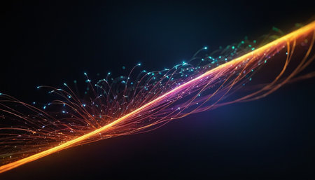 Vibrant fiber optic filaments radiate vivid blue and orange points, creating a lively, intricate web of energy against a shadowy backdrop.