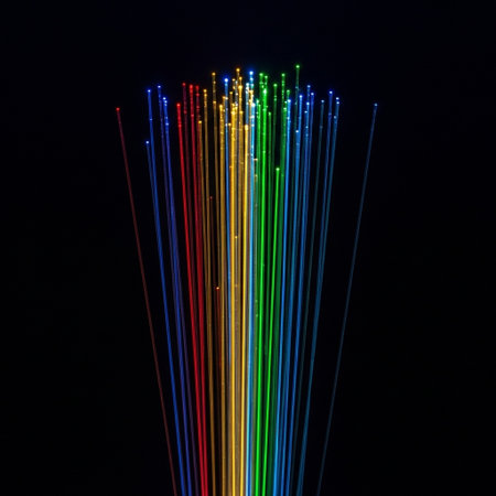 Close-up of colorful fiber optic strands glowing with rainbow light against a dark background.