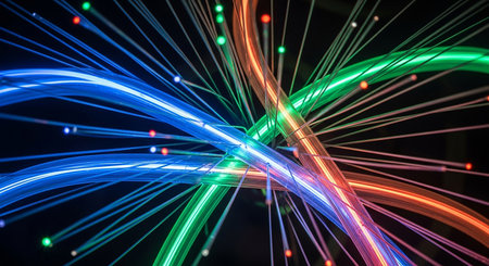 Abstract depiction of colorful fiber optic strands conveying speed and technology in a modern digital landscape, enhancing the visual appeal and innovation concept