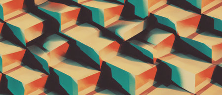 Complex arrangement of overlapping geometric shapes with varied halftone textures