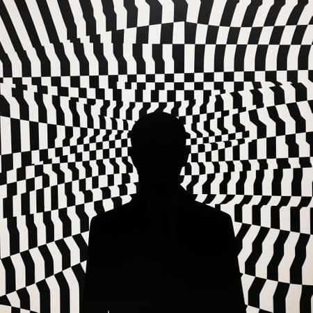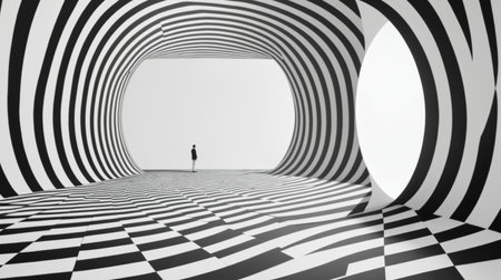 a man stands silhouetted against a black and white grid, reminiscent of op art paintings. the striped pattern creates a surrealistic atmosphere, while the illusion of wallpaper portraits adds an ominous touch. the installation is inspired by pop art, featuring distorted and exaggerated figures. ai generated