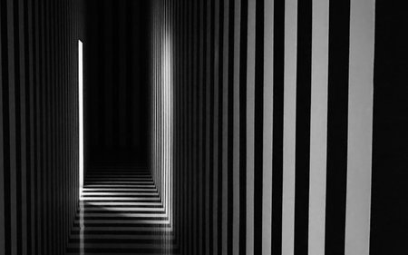 a mysterious black and white striped space in a beam of light from the door. the play of shadows and light in the corridor interior. linear perspective