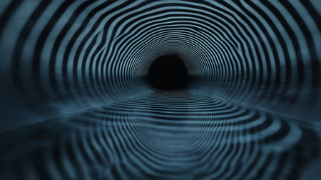 A hypnotic and surreal image of a tunnel, where concentric black-and-white stripes swirl toward an indistinct, infinite point. The water-like surface beneath the tunnel reflects the swirling patterns, enhancing the sense of depth and distortion, symbolizing the journey into unknown dimensions or perspectives.