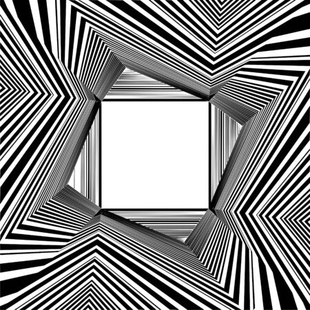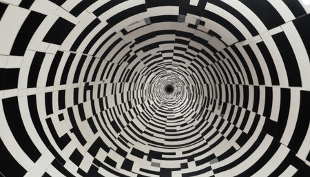 A series of black and white squares are nested within each other, creating an optical illusion of an infinite tunnel. The squares decrease in size as they move away from the viewer, giving the appearance of a deep and endless perspective.