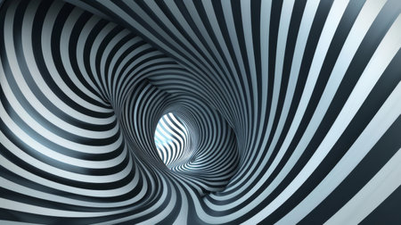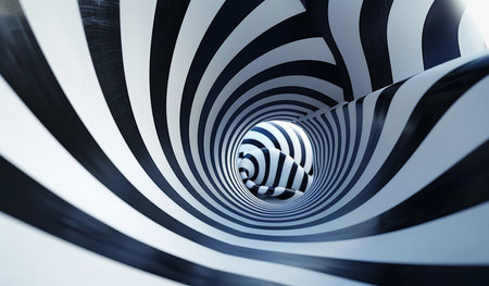 Dynamic abstract spiral featuring alternating black and white stripes creating a hypnotic tunnel effect with depth and motion.