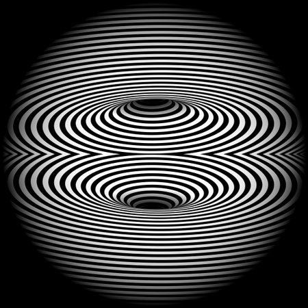 Op art, optical art sphere, hypnotic distorted lines background. Black and white tunnel wallpaper. Psychedelic twisted stripes pattern. Template for posters, banners, covers. Vector optical illusion