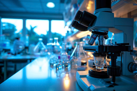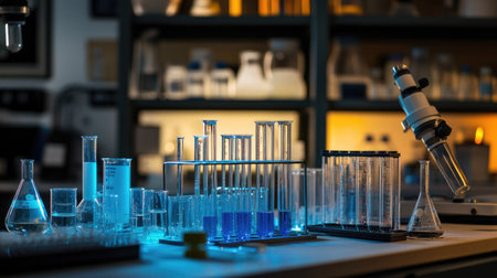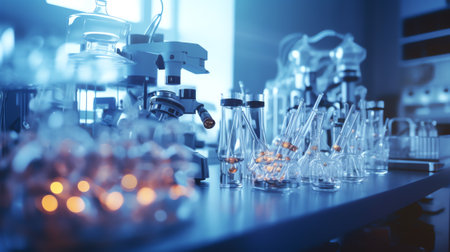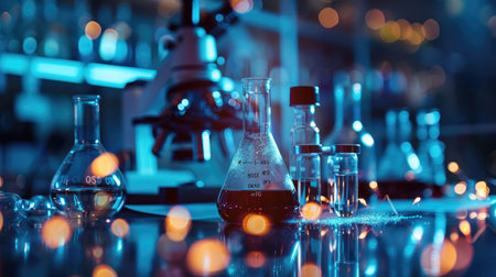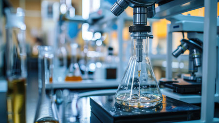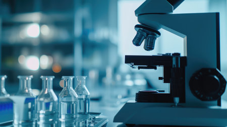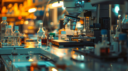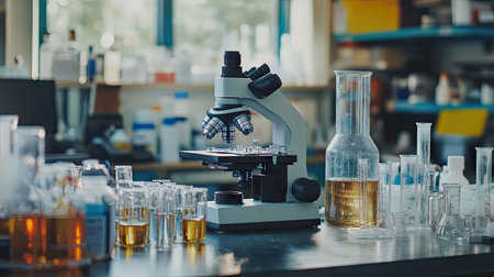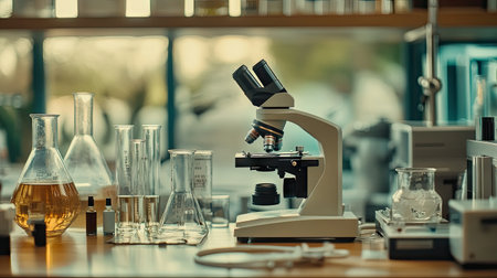 Microscope on a laboratory bench surrounded by glass beakers, test tubes, and scientific instruments. Ideal for showcasing medical chemistry and laboratory research.