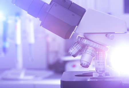 compound microscope in blue science medical technology laboratory background