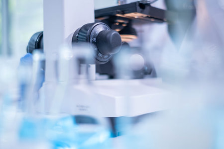 Scientific laboratory with a microscope and various glassware on a workbench. Background includes equipment for medical