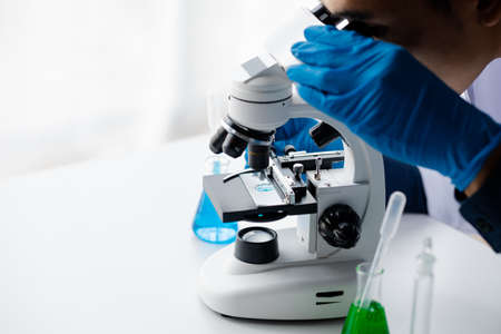 scientist hands with microscope, examining samples and liquid.