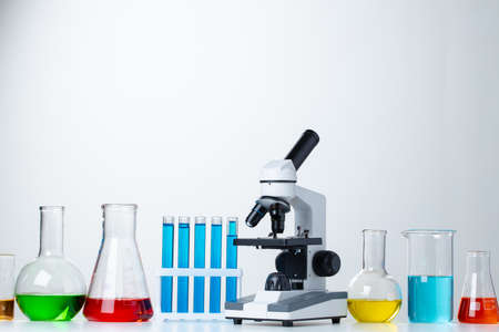 Research laboratory. Test tubes and microscope on the table on a white.