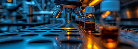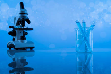 Microscope and test tube in laboratory, science research and development concept