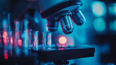 A close-up view of a laboratory microscope with test tubes in neon blue and red lighting, highlighting science, research, and biotechnology.