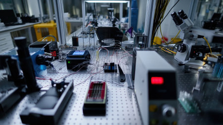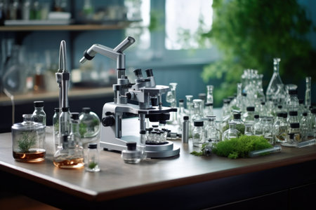 a science laboratory with a microscope and test tubes