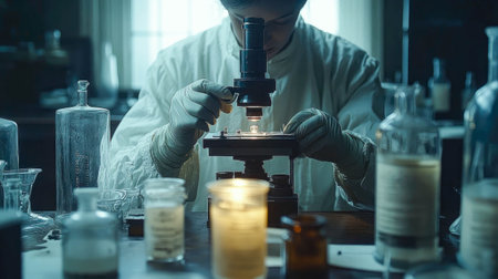 A scientist in an old-fashioned laboratory, wearing gloves and carefully examining a sample under a vintage microscope, surrounded by glass beakers and dim candlelight.