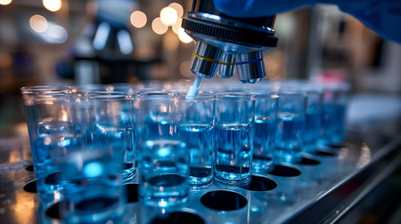A scientist in blue gloves focuses on examining a specimen beneath a microscope. The lab setup includes various test tubes filled with liquid samples, illuminated by soft lighting, indicating meticulous research in progress. Generative AI