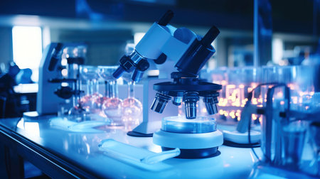 microscope on a table in a chemical or medical laboratory. science and innovation. analyzes. research and development. AI generated