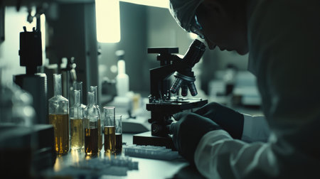 A dedicated scientist in a modern laboratory setting is focused on examining samples under a microscope, surrounded by essential glassware and equipment.
