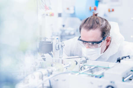 Engineering scientist working with advanced technology medical device in science laboratory for experimental research.