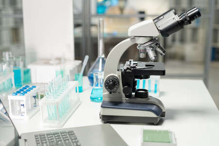 Workplace of contemporary researcher or scientist in clinic laboratory equipped with microscope, flasks and laptop
