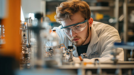 An engineer testing equipment in a lab, with various scientific instruments and safety gear visible.