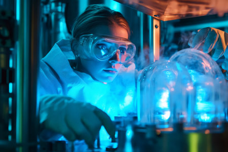 Female scientist wearing protective goggles and gloves operating scientific equipment producing cold vapor for research and development