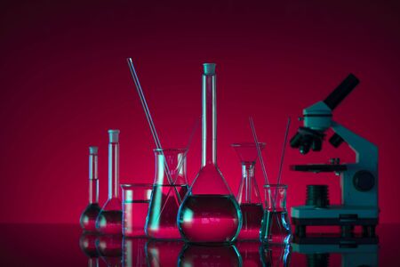 Chemical laboratory concept. Experiment with liquids. Red background. Place for logo.