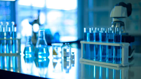 Row of blue liquid chemical tube in laboratory, Science and technology healthcare concept