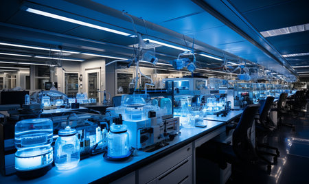 high-tech laboratory, with rows of microscopes and advanced equipment, created with generative ai
