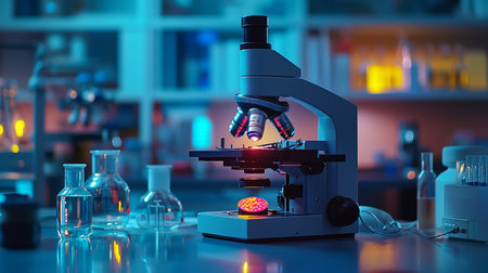 A microscope in a laboratory setting with flasks and test tubes, illuminated in blue and orange lighting.