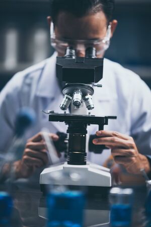 Asian Scientist working on blue test tube to analysis and develop vaccine of covid-19 virus in lab or laboratory in technology medical, chemistry, healthcare, research concept. Experimental science