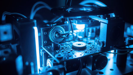 Modern engineering excellence in high-precision mechanical component printing under neon lights. concept of advanced manufacturing, futuristic innovation, precision technology, industrial design.
