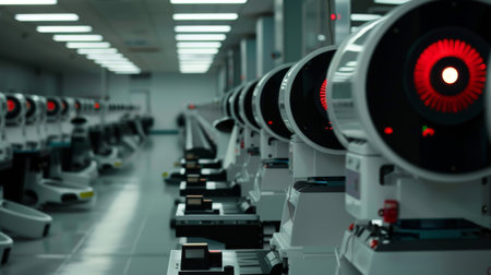 Rows of automated machines with red lights in a high-tech factory ai generated