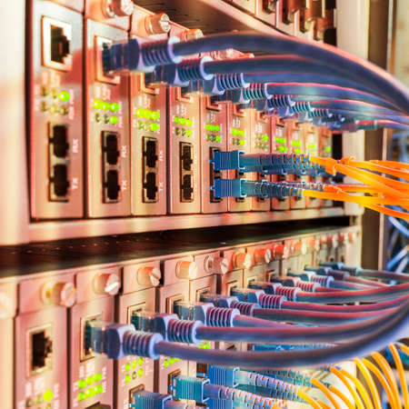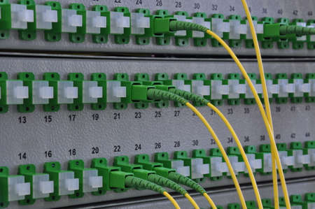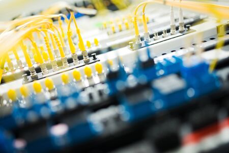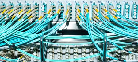 Technology network center with fiber optic equipment patch cords closeup