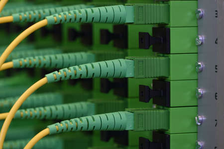 Optical cable in internet network devices. Green and yellow optical fiber cable in switch. Concept of modern Internet connection. Selective focus, close up, soft and blurred background.