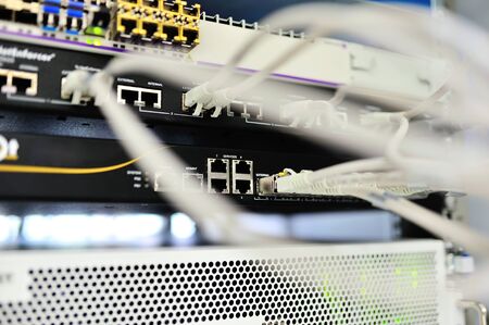 Close up view of internet equipment and cables in the server room. Broadcast system room.