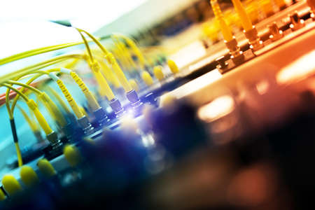 Closeup of fiber optics cables and termination cards