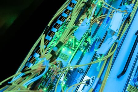 Working servers, switches or routers in data center with a lot of led lamps and cables