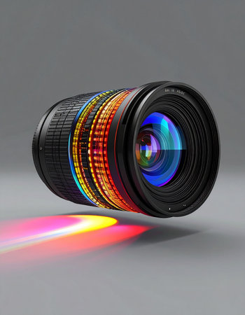 A professional camera lens floats weightlessly against a neutral background, bathed in a vibrant spectrum of rainbow light.