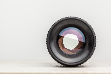 Camera lens on a wooden table. Selective focus. Shallow depth of field