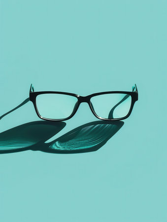 Black eyeglasses cast a long shadow on a light blue background.