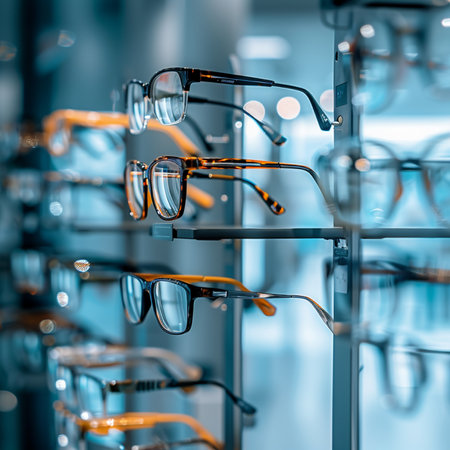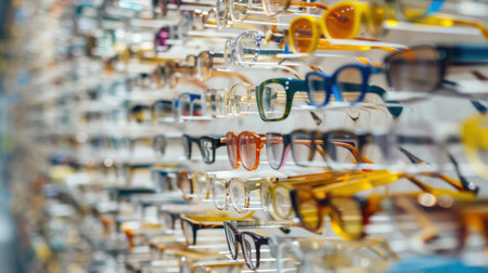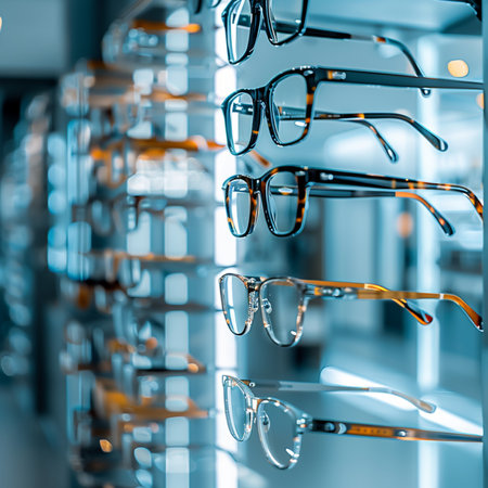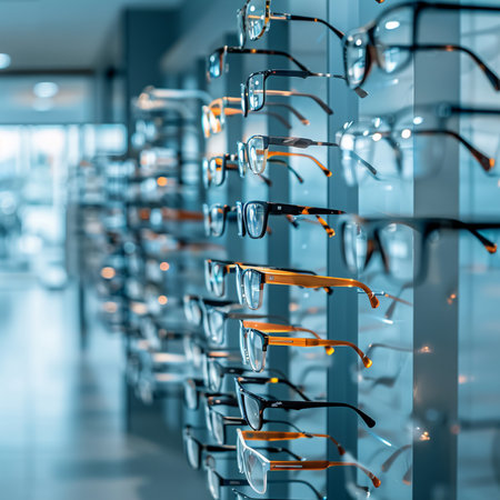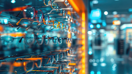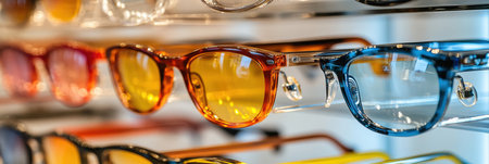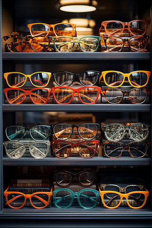 Glasses in a row on a shelf in a modern optics store