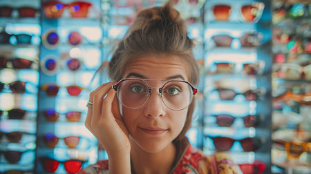 Woman choosing glasses at optics store