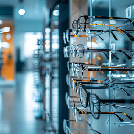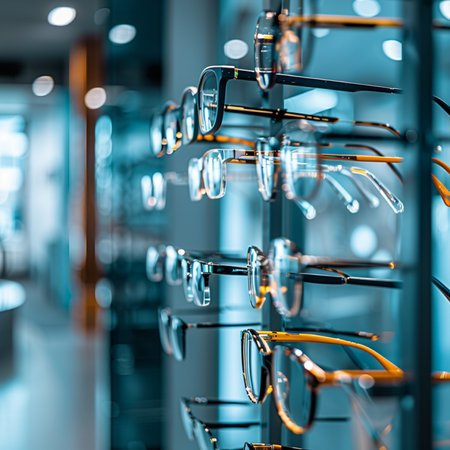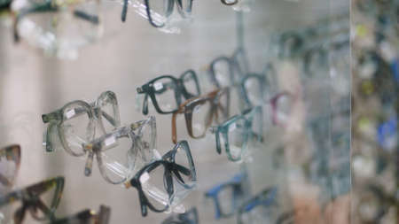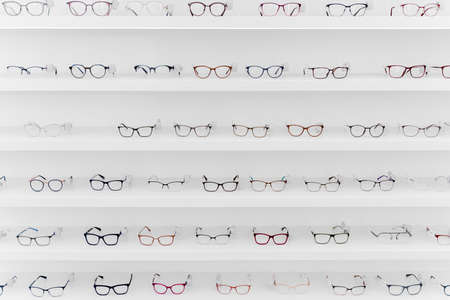 Glasses for sight and vision correction in a modern optics store.
