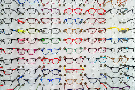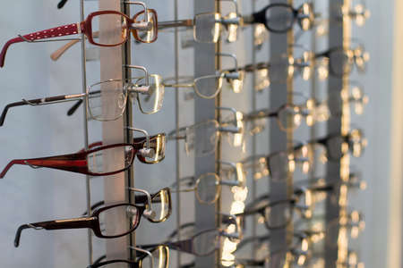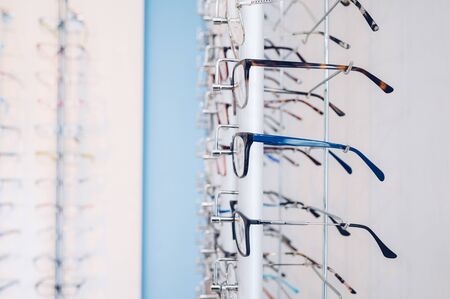 Glasses for sight and vision correction in a row in optical store