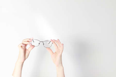 glasses in hands on a light banner. free space for text