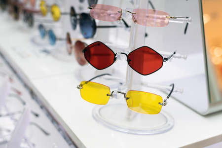 Sunglasses with colored lenses in shop window
