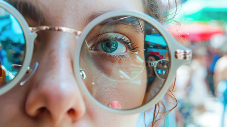 A closeup shot of a person wearing glasses with a reflection of another person in the lenses, showcasing the importance of vision care and eye glass accessories AIG50
