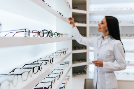 Attractive young female doctor in ophthalmology clinic. Doctor ophthalmologist is standing near shelves with different eyeglasses.