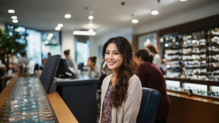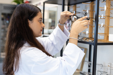 Indian woman professional optician selling checking details of glasses in optical shop. Female optician accessory eyeglasses shop.